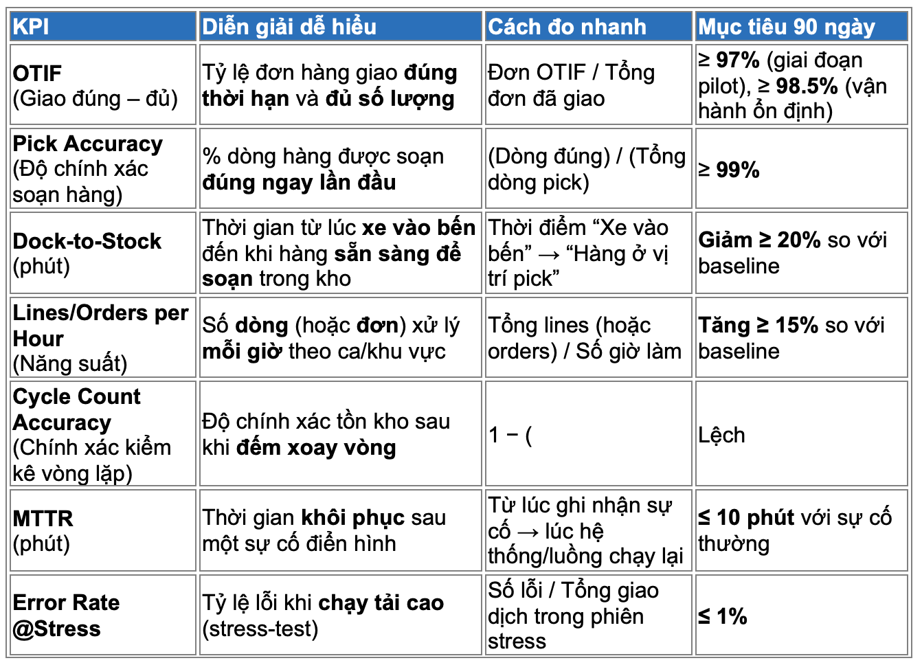 - Nhóm Chất lượng thao tác: Pick Accuracy, Cycle Count Accuracy.