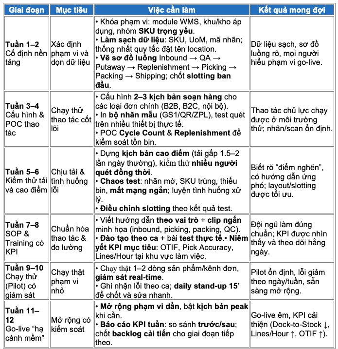 - Ưu tiên dữ liệu trước (data-first): chốt ngay phạm vi dữ liệu cần cho ngày go-live đầu tiên: SKU, đơn vị tính (UoM), mapping mã vạch, quy tắc in nhãn.