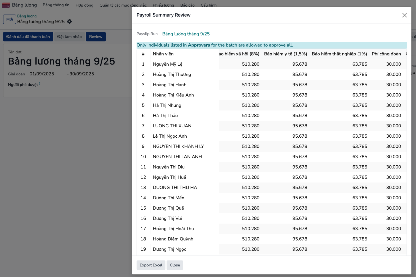 Phê duyệt lươngđa cấp ngay trên phần mềm từ người lập → trưởng phòng nhân sự → Giám đốc tài chính → Ban giám đốc.